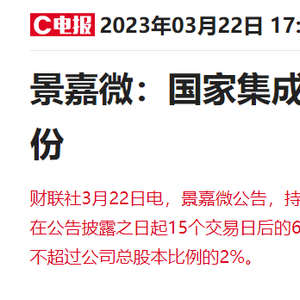 财联社3月22日讯(实习编辑 刘星雨 编辑 平方)总市值近400亿元的国产GPU芯片龙头景嘉微盘后公告,持股8.08%的第二大股东大基金计划在公告披露之日起15个交易日后的6个月内以集中竞价交易方式减持公司股份不超过910.24万股,即不超过公司总股本比例的2%。