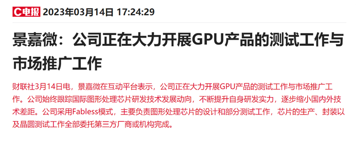 景嘉微3月14日在互动平台表示,公司正在大力开展GPU产品的测试工作与市场推广工作。公司始终跟踪国际图形处理芯片研发技术发展动向,不断提升自身研发实力,逐步缩小国内外技术差距。公司采用Fabless模式,主要负责图形处理芯片的设计和部分测试工作,芯片的生产、封装以及晶圆测试工作全部委托第三方厂商或机构完成。