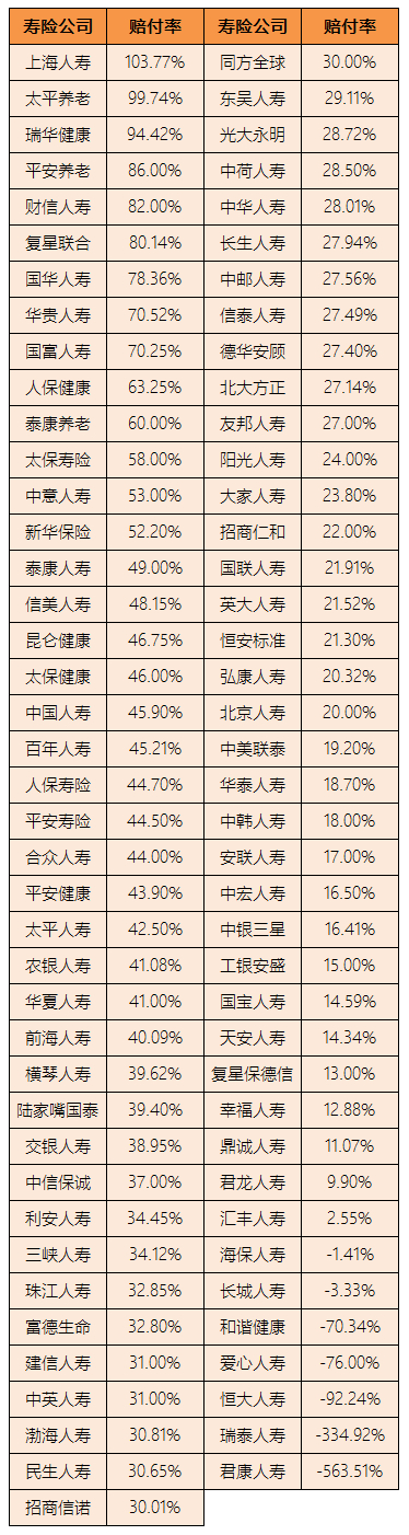 记者注意到,在赔付率低于50%的险企中,有10家低至负数。其中包括7家人身险公司和3家财险公司,分别是:君康人寿(-563.51%)、瑞泰人寿(-334.92%)、恒大人寿(-92.24%)、爱心人寿(-76%)、和谐健康(-70.34%)、长城人寿(-3.33%)、海保人寿(-1.41%)、太平科技(-213.3%)、安信农业(-76.22%)、建信财险(-2.03%)。