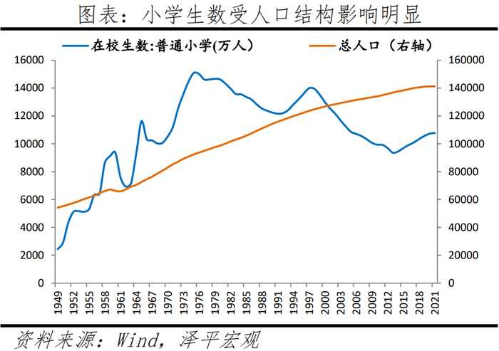 2010年左右以来,部分人口回流中西部,东部地区面对用工压力主动推进大学毕业生、技能人才等外来人口本地化,小学生增速明显加快,东北地区人口加速流出。2009年在长三角和珠三角地区务工的外出农民工占全国外出农民工比例分别比上一年下降2.4%和7.6%,2009年下半年东部沿海地区出现明显的“用工荒”,根据麦可思研究院数据,2021年珠三角地区本科毕业生能留在本地就业的比例高达90%,但数量仍不及用工需求。面对用工压力,东部地区主动深化户籍制度改革、吸引外来人口安居乐业。比如,2011年起以鞋服产业闻名全国的晋江在福建率先实行零门槛“居住证”制度,并于2013年率先实行“无房也落户”政策。在2014年国务院要求进一步推进户籍制度改革后,2015年福建宣布全面放开除福州、平潭、厦门外地区的落户限制;广东宣布,除广州深圳外,放开直系亲属投靠,放宽大专以上(含大专)学历毕业生及技能人才、特殊专业人才入户条件等。2010-2020年,东部、中部、西部、东北地区常住人口分别年均增长1.08%、0.22%、0.61%、-1.05%,常住人口占比分别变化2.2、-0.8、0.2、-1.2个百分点。尽管东部地区常住人口增长率明显下降,但其小学生增长率却不降反升。东部、中部、西部、东北地区小学生数分别年均增长2.53%、-0.15%、0.09%、-2.22%,小学生数占比分别变化6.1、-2.7、-2.0、-1.4个百分点。