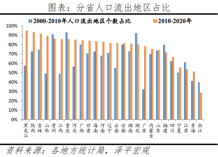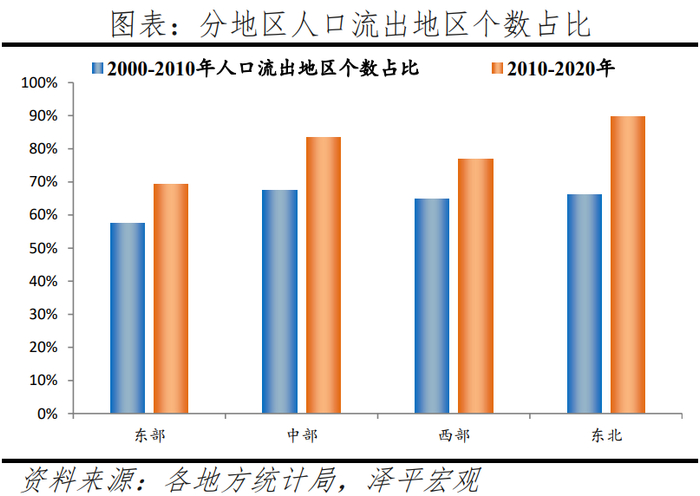 分地区看,东北地区人口流出地区个数占比从66%增至90%,东部地区从58%增至69%,中部地区从67%增至84%,西部地区从65%增至77%。东部地区人口流出地区数量上升,2000-2010年、2010-2020年分别为289、349个,占比从57.5%增至69.4%;中部地区人口流出地区大幅上升,分别为376、466个,占比从67.4%上升至83.5%;西部地区人口流出地区个数分别为592、701个,占比从64.8%增至76.8%;东北地区人口流出地区个数小幅上升,两个时间段分别为117、159个,占比从66.1%增至89.8%。分省看,扣除京津沪和缺失数据较多的新疆、西藏等地区,黑龙江人口流出地区较多,2010-2020年流出地区个数占比为94.7%,然后依次是陕西93.1%、吉林91.5%、山西89.2%。近10年东北地区人口流失较严重,长三角、珠三角地区等发达地区的繁荣发展,对东北地区人口有强大吸引力。