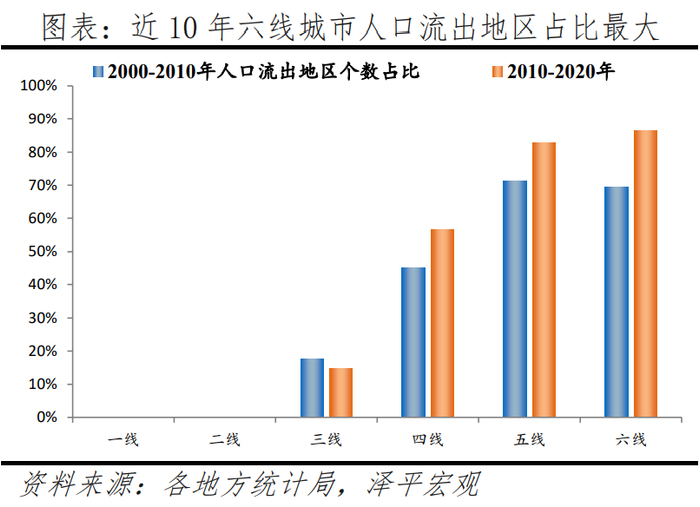 分线看,一、二线城市均无人口流出地区,三线城市从18%降至15%,四线城市从45%增至57%,五线城市从71%增至83%,六线城市从69%增至86%。一、二线城市一直保持强劲的人口流入态势,2000-2010年、2010-2020年人口流出地区个数均为0,同期三线城市人口流出地区占比小幅上升,占比从17.6%下降到14.9%;四线城市两个时间段人口流出地区个数分别为119、149个,占比从45.2%增至56.7%。五六线城市人口流出地区个数占比总体上增长趋势较大,其中五线城市从71.1%增至82.9%,六线城市从69.3%增至86.4%。可以看出,六线城市人口流出地区个数占比增幅最为显著,达17.1个百分点,高于三、四、五线的-2.7、11.4、11.8个百分点。