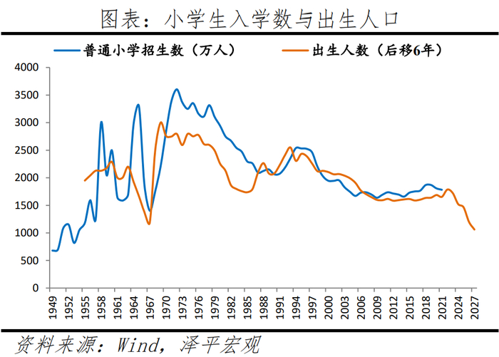 2)分线城市层面,一二线城市常住人口持续大幅流入,三线稍有流入,四线基本平衡,五六线持续净流出。2010年后,一二三线城市外来人口日趋本地化,分线城市小学生数增速的梯度分化更为明显。2010-2020年,在全国小学生数年均增长为0.7%的背景下,一二三线城市小学生数年均增速分别为3.8%、4.7%、2.4%,而四五六线城市小学生年均增速分别为1.3%、-0.5%、-1.0%,分线城市增速最大值和最小值的差扩大到5.7个百分点。