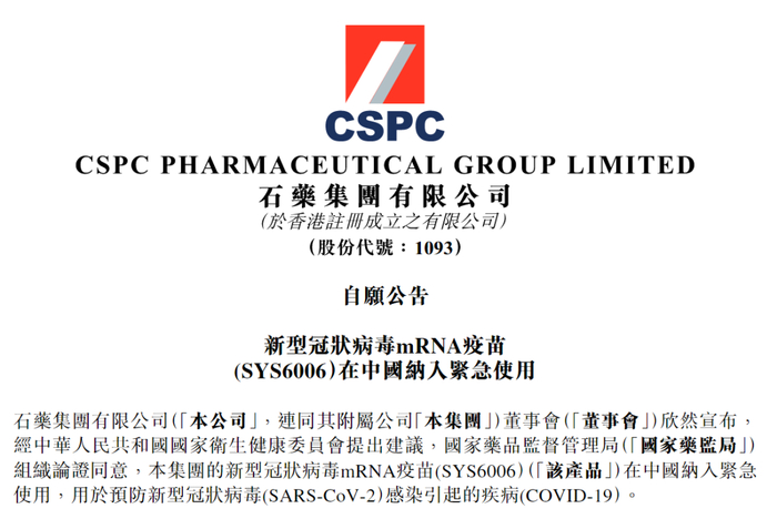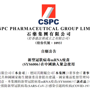 3月22日,港股上市公司石药集团发布公告:经国家药监局组织论证同意,公司新冠mRNA疫苗(SYS6006被纳入紧急使用。