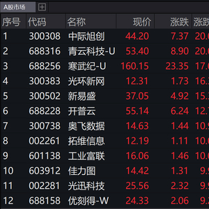 AI算力概念48只成分股中,47只当日收涨。其中,中际旭创(300308)、青云科技(688316)20cm涨停,寒武纪(688256)、光环新网(300383)等涨超10%,拓维信息(002261)、工业富联(601138)等个股涨停。