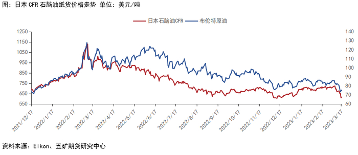 2022年3月初,受俄乌冲突影响,原油价格大幅拉升,在此背景下,日本石脑油纸货价格迅速突破1000美元/吨,并在3月9日触及创纪录的1131.50美元/吨。4月末,受中国疫情蔓延导致需求减缓影响,石脑油价格与原油价格走势出现显著背离,全年震荡下行,且盘面走势情况长期弱于原油。
