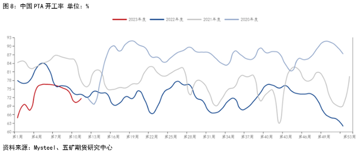 2023年中国PTA新增产能预计为1450万吨,而PX产能预计增加500万吨,纸面上来看,这将表明对PX的需求在上升,但实际上,PTA开工率已经从2021年的84%下降到当今的70%左右。如果中国房地产市场依然低迷,那么下游衍生品(家居建材、装饰品)的需求也会受到影响,并传导至PX的实际消费需求。