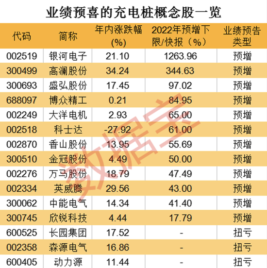 证券时报·数据宝统计,A股充电桩板块中,已经有22家公司披露2022年业绩,其中12家预增,3家扭亏,其中银河电子、高澜股份业绩翻番,长园集团、森源电气、动力源业绩扭亏。