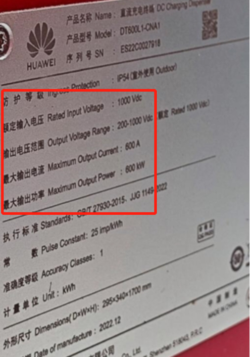 近日,华为超充桩在网络曝光,有网友发布了一组华为自主研发生产的600kW超充桩实拍图。从铭牌信息可以看到,该超充桩的制造厂商为华为数字能源技术有限公司,充电桩型号为DT600L1-CNA1,输出电压范围200-1000V,最大输出电流600A,最大输出功率600kW。