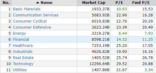 今年以来标普银行板块下跌超15%,地区银行ETF跌幅近20%。最新统计显示,截至21日收盘,金融股是标普500指数中估值最低的板块之一,仅好于原材料和能源业。板块大跌也进一步打压了长期估值,目前能源板块远期市盈率为7.9倍,而金融业的远期市盈率仅有11.2倍,创疫情以来新低。
