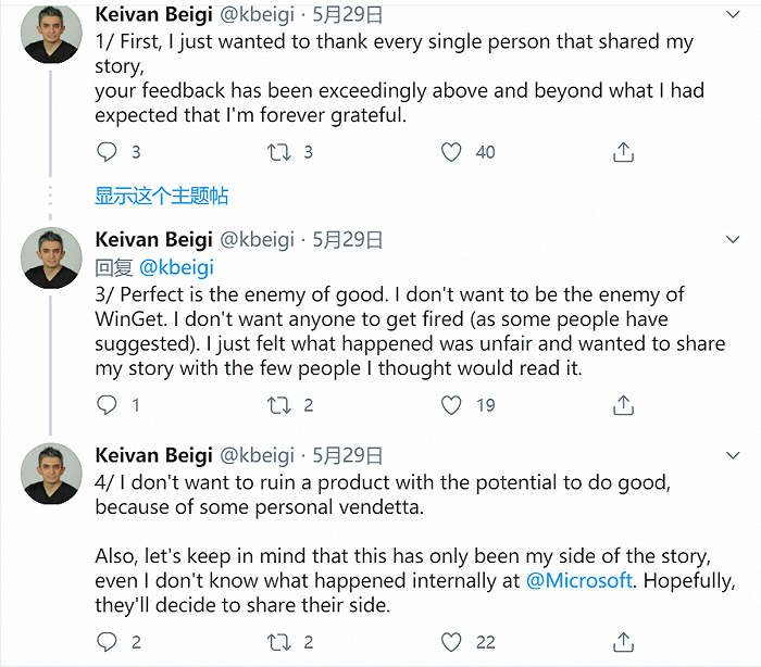 Keivan在推特上发帖表示,自己曾开发了一款名为AppGet的开源项目,微软App事业部产品经理曾向其表达过对AppGet的兴趣,并以邀请其加入微软为由,就AppGet项目的设计思路进行了多次深入交流,时间跨度长达5个月。