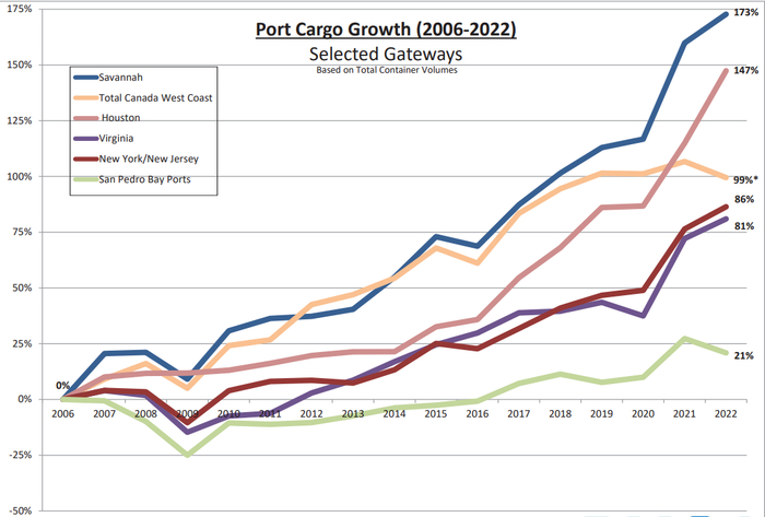 与美西港口的“面红耳赤”局面不同的是,美东港口工人工会的谈判一直处在比较“和谐友爱”的局面之中,由此就引发出了另一个现象:本要通过美西港口进入美国的货物改道从休斯顿港口、美东港口进入了美国,这个影响一直延续到了2023年,充分说明了市场对美西港口的“信任感”的降低。