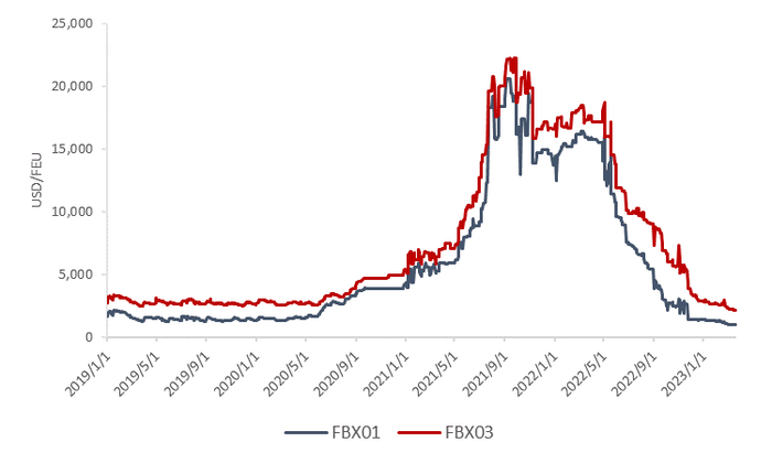 通过太平洋商业航运协会(Pacific Merchant Shipping Association, PMSA)提供的数据(图1)可以看到2022年洛杉矶和长滩港的货量同比增长了21%,相比2021年有所下滑;而纽约/新泽西港口货量去年同比增长86%(11%+)、萨瓦纳港同比增长173%(14%+)、休斯顿港同比增长147%(70%+)——“西货东移”的影响十分显著。从价格的角度来说可以看到,远东 – 美东航线运价在2022年的下跌速度是明显小于美西线的。