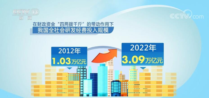在财政资金“四两拨千斤”的带动作用下,我国全社会研发经费投入规模从2012年的1.03万亿元增长到2022年的3.09万亿元,首次突破3万亿元大关,比上年增长10.4%,自“十三五”以来已连续7年保持两位数增长。
