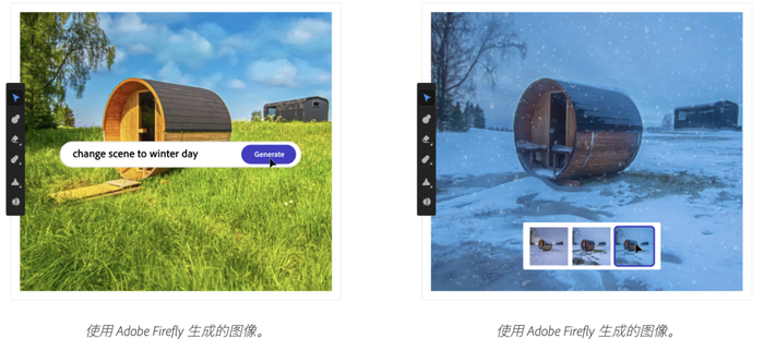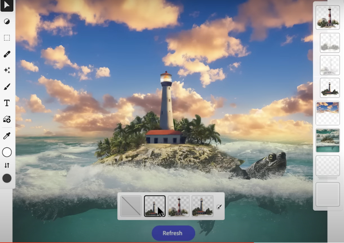 又比如,自动识别出图片里面的灯塔,Adobe Firefly 可以使用 AI 来生成不同版本的灯塔,并实现替换。