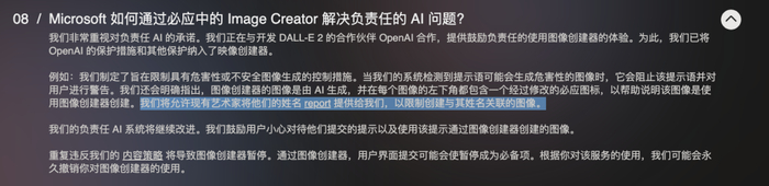 此外,微软也在规则中注明,为了遏制 Image Creator 的潜在滥用,“我们已确保将 OpenAI 的安全措施以及其他保护措施纳入 Image Creator。例如,我们实施了旨在限制有害或不安全图像生成的控制措施。当我们的系统检测到提示可能会生成可能有害的图像时,它会阻止提示并警告用户。我们还明确表示 Image Creator 的图像是由 AI 生成的,并且在每张图像的左下角加上了一个 Bing 图标的水印,帮助大家识别该图像是使用 Image Creator 创建的。”