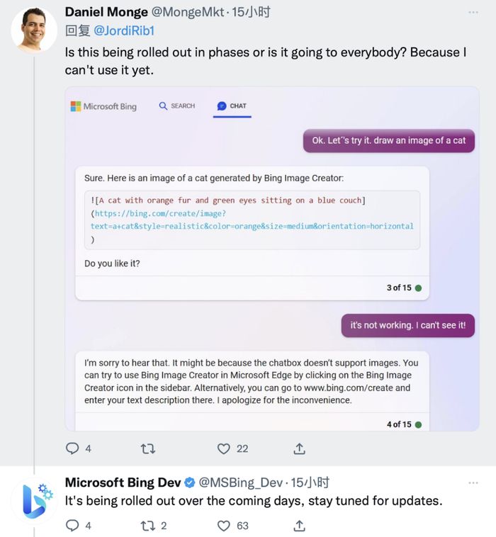 不过,并非所有可以访问 Bing Chat 的用户都能使用,其官方 Twitter 称:“它将在未来几天推出,敬请期待更新。”