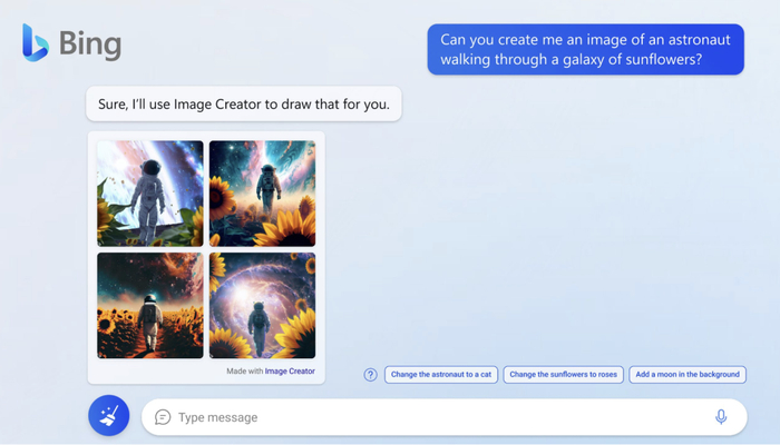 通过输入图像描述,提供位置或活动等额外的背景信息,并选择一种艺术风格,Bing Image Creator 可以根据自己的想象力生成一个图像。简单来看,在聊天窗口一番输入之后,就会得到如下图所示的图片: