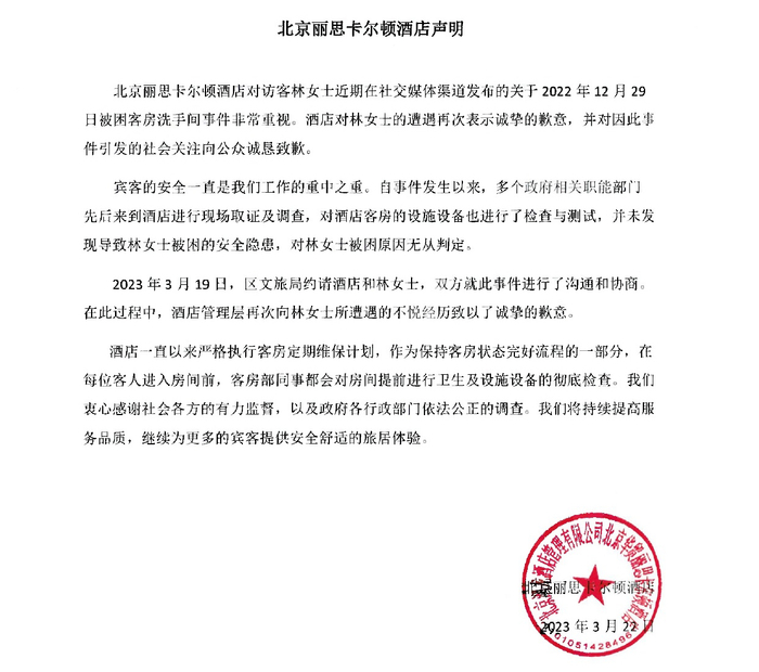 3月13日,演员林琳奇在社交媒体发布视频,反映北京华贸丽思卡尔顿酒店安全设施落后,安全服务不到位,导致其被困酒店卫生间。当时林琳奇没有带手机,卫生间的挂壁电话故障无法通话,卫生间内没有其他应急报警装置。最终在被困近四小时后,林琳奇将卫生间的门锁破坏才得以自救逃出。