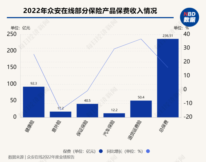 报告显示,众安保险去年总保费增加约16.1%,至236.51亿元。分险种来看,退货运费险、健康险等险种快速增长,带动总保费上升。其中,第一大险种健康险实现保费92.3亿元,同比增长25.7%;此外,退货运费险实现保费50.39亿元,同比增长36.7%。