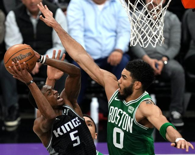 3月22日,福克斯在塔图姆的严防下,强行投篮。 图/新华社