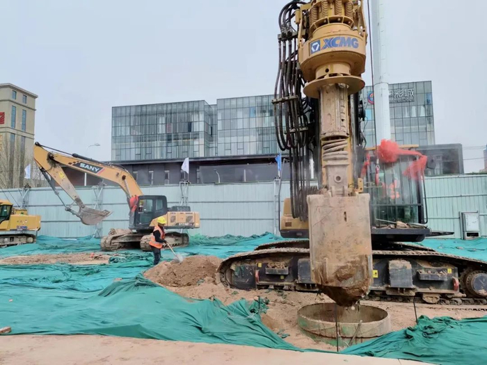 “5号线一期工程首桩开钻!”随着一声令下,施工人员操纵着巨大的旋挖钻机向着地面破土深入,正式开始打桩作业。挖机、吊车、装载机等设备和现场施工人员共同勾勒出一幅繁忙的建设图景。