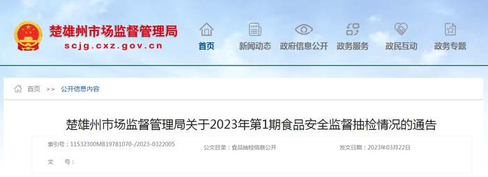云南省楚雄州市场监督管理局发布2023年第1期食品安全监督抽检情况