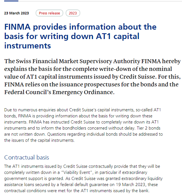 23日,瑞士金融市场监管局(FINMA)就其对瑞信发行的额外一级资本债券(AT1)完全减记的依据发表声明,称“由于对瑞信资本工具(即所谓的AT1债券)的大量询问,FINMA提供了有关减记这些工具的基础的信息。FINMA已指示瑞信完全减记其AT1工具,并立即通知相关债券持有人。二级债券不减记。有关个别债券的问题应向资本工具的发行人提出。”