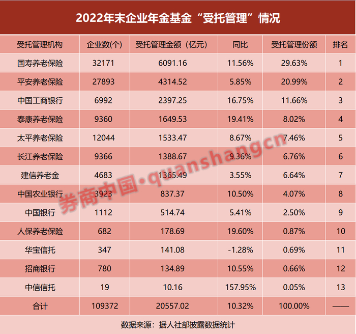 企业年金相关的另一重要业务为受托管理。多年来具有企业年金基金法人受托机构资格的有13家,2021年人社部对华宝信托不予延续企业年金受托资格,受托管理机构减少至12家,包括6家保险机构、4家银行、1家养老金公司、1家信托公司。2022年末,连同华宝信托在内合计受托管理资产2.05万亿元,同比增长10.3%。