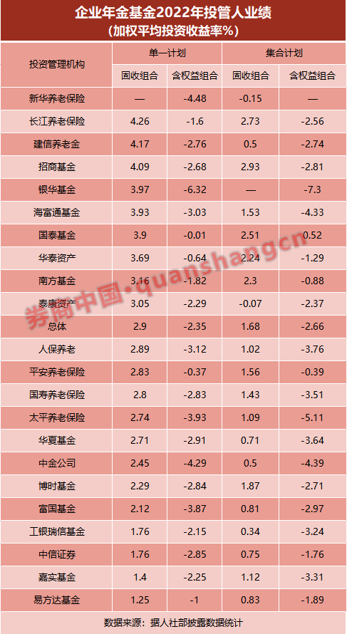 从企业年金主要的单一计划看,各家管理人的含权益组合,2022年收益率均为负;固收组合收益率在1.25%-4.26%区间。