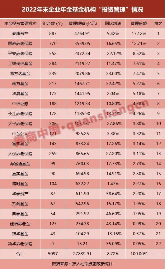 截至2022年末,泰康资产仍是企业年金市场最大的投资管理机构,其管理887个组合,相较上年末增加85个组合;管理规模为4765亿元,同比增长9.4%。据