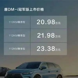 新款冠军版的重点升级还在配置上。目前唐DM-i冠军版售价20.98-23.38万,都是纯电续航112公里,只不过车型从原来的两款增加到了三款,最低配的112KM尊贵型售价不变,依旧是20.98万,但是配置增加了:255毫米宽度的轮胎、补胎工具、FSD可变阻尼悬架、12.3英寸液晶仪表、中控屏尺寸升级到15.6英寸等。