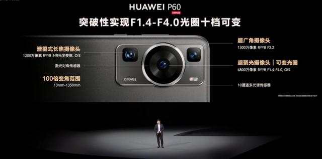 影像方面,华为P60系列业界首创超聚光主摄(4800 万像素),支持 F1.4-F4.0 十档物理光圈智能可变,P60 的另外两颗摄像头是 1300 万像素的超广角摄像头(RYYB F2.2)和 1200 万像素潜望式长焦摄像头(RYYB,支持 5 倍光学变焦、OIS)。