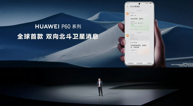 华为称,华为P60系列是全球首款支持双向北斗卫星消息的大众智能手机,无地面网络信号时,能发送、也能接收到对方回复的消息。
