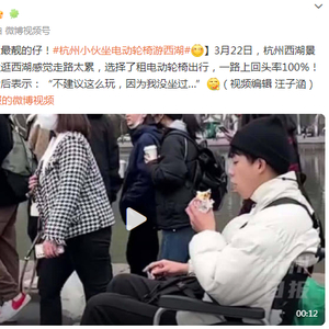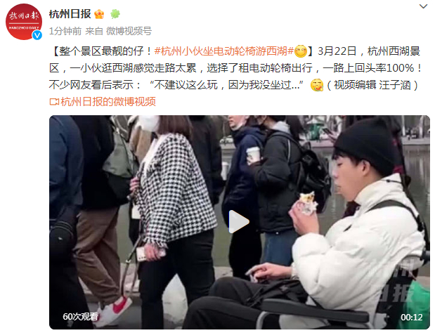 整个景区最靓的仔!杭州小伙坐电动轮椅游西湖 环球网 环球网官方账号 2023.03.2320:10 关注 3月22日,杭州西湖景区,一小伙逛西湖感觉走路太累,选择了租电动轮椅出行,一路上回头率100%!不少网友看后表示:“不建议这么玩,因为我没坐过…”。