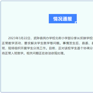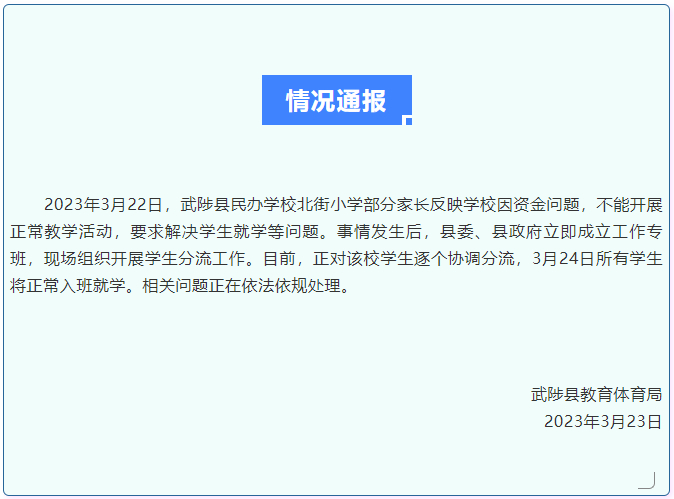 针对网传北街小学倒闭、学生将辍学传闻,3月23日,武陟县教育体育局通报,3月22日,武陟县民办学校北街小学部分家长反映学校因资金问题,不能开展正常教学活动,要求解决学生就学等问题。事情发生后,县委、县政府立即成立工作专班,现场组织开展学生分流工作。目前,正对该校学生逐个协调分流,3月24日所有学生将正常入班就学。相关问题正在依法依规处理。