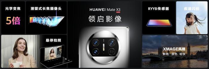 在算法引擎上,华为 Mate X3 还首发了 AI 质感图像引擎,还原肉眼所见的清晰画面。体验方面,华为 Mate X3 还实现了折叠旗舰最快的拍照性能,快速对焦 + 快门速度 + 去模糊算法,让抓拍成片率提升 XXX%。得益于折叠屏形态优势,华为 Mate X3 能够悬停摄影,悬停模式下能够自动抓拍,支持延时摄影与流光快门模式,各种模式轻松上手。