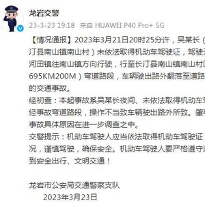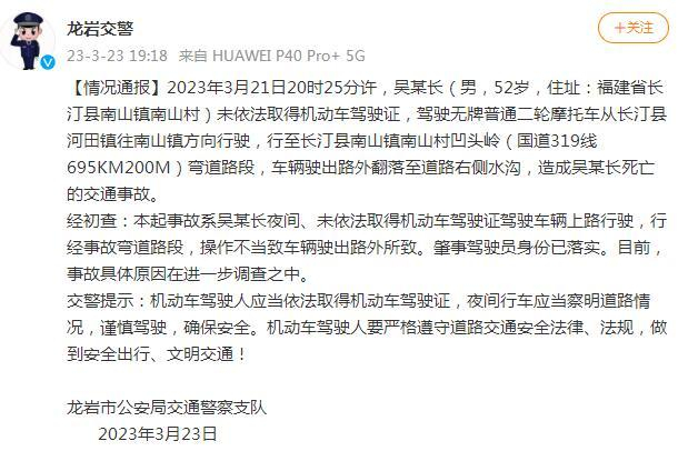 【情况通报】2023年3月21日20时25分许,吴某长(男,52岁,住址:福建省长汀县南山镇南山村)未依法取得机动车驾驶证,驾驶无牌普通二轮摩托车从长汀县河田镇往南山镇方向行驶,行至长汀县南山镇南山村凹头岭(国道319线695KM200M)弯道路段,车辆驶出路外翻落至道路右侧水沟,造成吴某长死亡的交通事故。