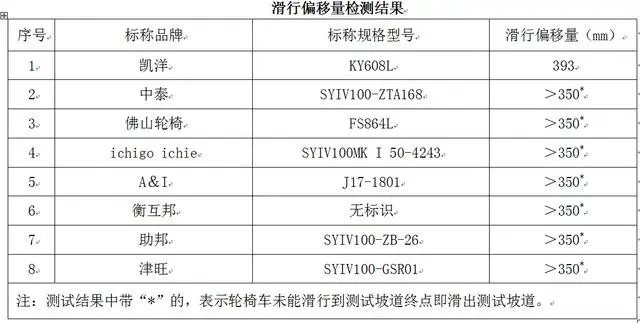 滑行偏移量是手动轮椅车的重要检测项目。国家标准要求手动四轮轮椅车滑行偏移量不应超过350mm。滑行偏移量越大,轮椅车在行进时越容易发生偏移,本次比较试验测试结果显示购买的20辆轮椅车中,标称凯洋、中泰、佛山轮椅、ichigo ichie、A&I、衡互邦、助邦、津旺等品牌的8辆轮椅车滑行偏移量项目超过350mm,其中7辆车滑行偏移严重,未能滑行到测试坡道的终点即滑出测试坡道。