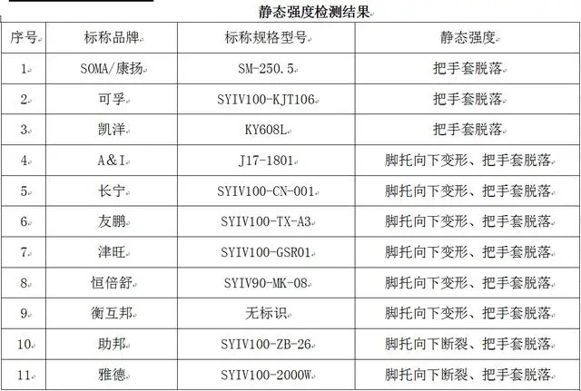 本次比较试验中,标称SOMA/康扬、可孚、凯洋、A&I、长宁、友鹏、津旺、恒倍舒、衡互邦、助邦、雅德等品牌的11辆轮椅车在静态强度试验中出现了不同部件、不同程度的损坏和功能失效,其中8辆车脚托向下受力出现断裂或严重变形,不能正常使用。11辆车把手套出现脱落或位移,导致功能失效。