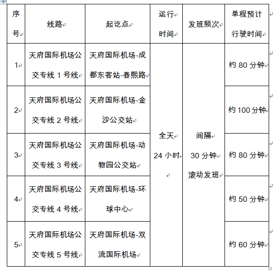 公交专线方面,经优化调整,共开行天府国际机场公交专线5条,分别由天府国际机场到达成都东客站、春熙路、金沙公交枢纽站、动物园公交站、环球中心、双流国际机场,覆盖市中心区域各个方向,所有线路均为全天24小时运营,间隔30分钟滚动发班,定线定班。如遇满座则即刻发班,高速直达市区,单程时间预计在50-100分钟之间。