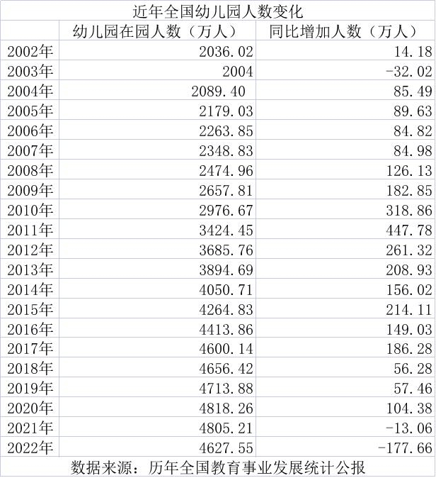 然而,随着近几年出生人口下滑,幼儿园在园人数出现拐点。2021年出现负增长,比上年减少13.06万人。3月23日新闻发布会公布的数据显示,2022年在园人数负增长加剧,比上年大幅减少177.66万人。