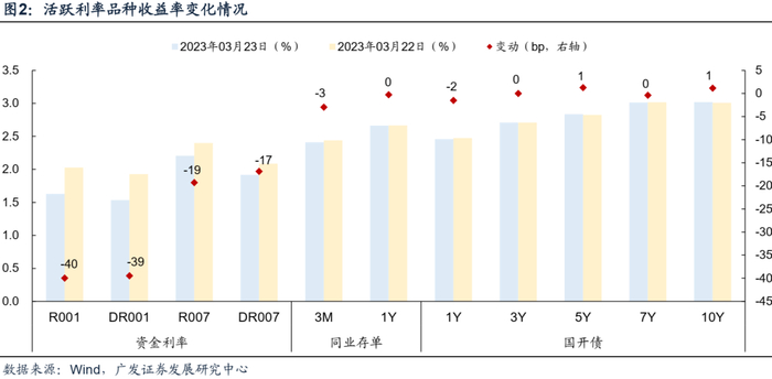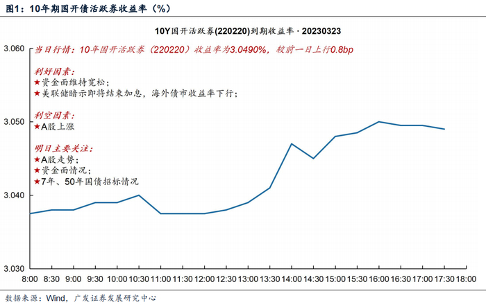 1. 市场回顾:资金面继续转松,长端利率小幅上行。截至3月23日,10年国开活跃券(220220)收益率为3.0490%,较前一日上行0.8bp。