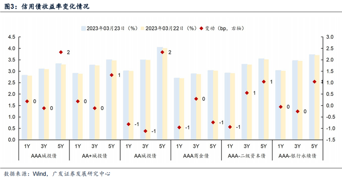 信用债方面,信用债收益率分化,波动范围在[-1bp,2bp],5Y信用债收益率上行,其余品种下行为主。