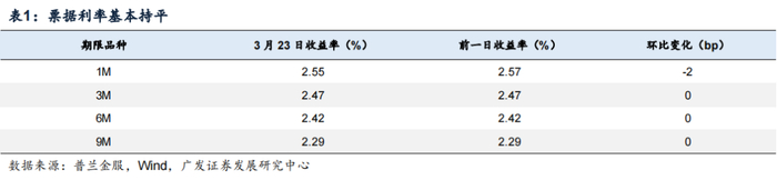 今日票据利率整体震荡调整,除1M票据利率下行2bp以外,其余均持平前一交易日。其中,1M票据收益率下行2bp至2.55%,3M、6M、9M票据收益率与前一日持平。