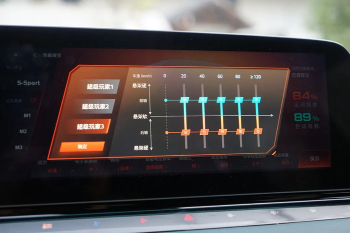 在电控悬架部分,有一个叫“超级玩家”的模式,也即是悬挂的自定义模式,里面可以进行三组预设,这并不奇怪。但有意思的是,MG7的底盘软硬调节居然可以细化到前后轴,以及各个速度区间,车子可以根据您预设好的时速,来调节前后轴悬挂的软硬度。