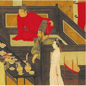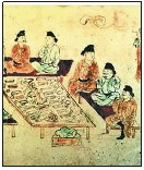 到了唐代,各种各样的高足坐具已相当流行,垂足而坐已成为标准姿势,人们已经基本上抛弃了席地而坐的方式,这时再用低矮的食案吃饭就非常不方便了。因此,高足的餐桌应运而生,称为“食床”。1955年在西安发掘的唐代大宦官高力士之兄高元珪墓,发现墓室壁画中有一个端坐在椅子上的墓主人像,双足并排放在地上,这是唐代中期以后已有标准垂足坐姿的证据。可以肯定地说,在唐代,至少在唐代中晚期,中国人已经基本上抛弃了席地而坐的方式,最终完成了坐姿的革命性历史性改变,为众人围坐会食共食提供了契机。