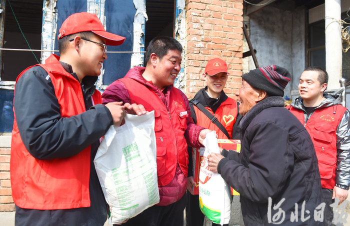 3月17日,青年志愿者刘意(左二)和伙伴一起,为平山县宋家口村90岁的孤寡老人韩贵锁送来米面油等生活用品。