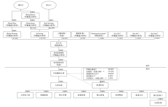 耐看娱乐的股东架构中,张栗坤、钟山通过BVI公司合计持有 79.53%的股份,二人为控股股东。其中,钟山持股约58.72%,张栗坤持股约20.81%,由张栗坤出任公司首席执行官兼董事会主席。