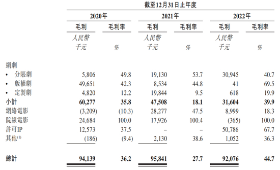 2021年时,耐看娱乐的营收支柱是定制剧,定制剧收入占年度营收的比例达到60.2%,但定制剧的毛利率偏低,又拉低耐看娱乐整体的毛利率水平。2020年,耐看娱乐的毛利率为36.2%,2021年下降至27.7%,2022年又上涨至44.7%。